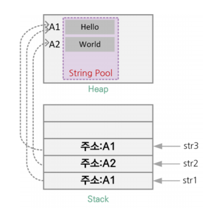 이 값을 str1, str3이 참조하게 된다,