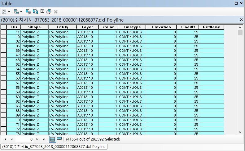 PoilyLine만 가져온 data attribute table을 열었습니다.
