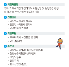 | 9월 2일 | 운영본부, 고용노동부, 현장실습지원센터/IPP센터, 국문입사지원서클리닉, 한국산업인력공단, 대학일자리사업단(진로/취업상담), 면접 이미지 컨설팅, VR면접체험, 무료이력서 사진촬영 및 인화, (주)오이솔루션, (주)마이나비코리아, 코웨이(주), 주식회사 엠금융서비스, (주)GIC, 오스템임플란트(주), 신화캐피탈, 하림그룹 (주)선진, (주)홍진HJC, 셀트리온, 동원그룹, KT estate, 동우화인켐(주), 미원상사&관계사, 일동제액, 힌국콜마, (주)모두투어네트워스, 에스원, 삼성SDS, 삼성엔지니어링, 농심그룹, CJ그룹, KOLON, |