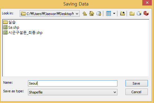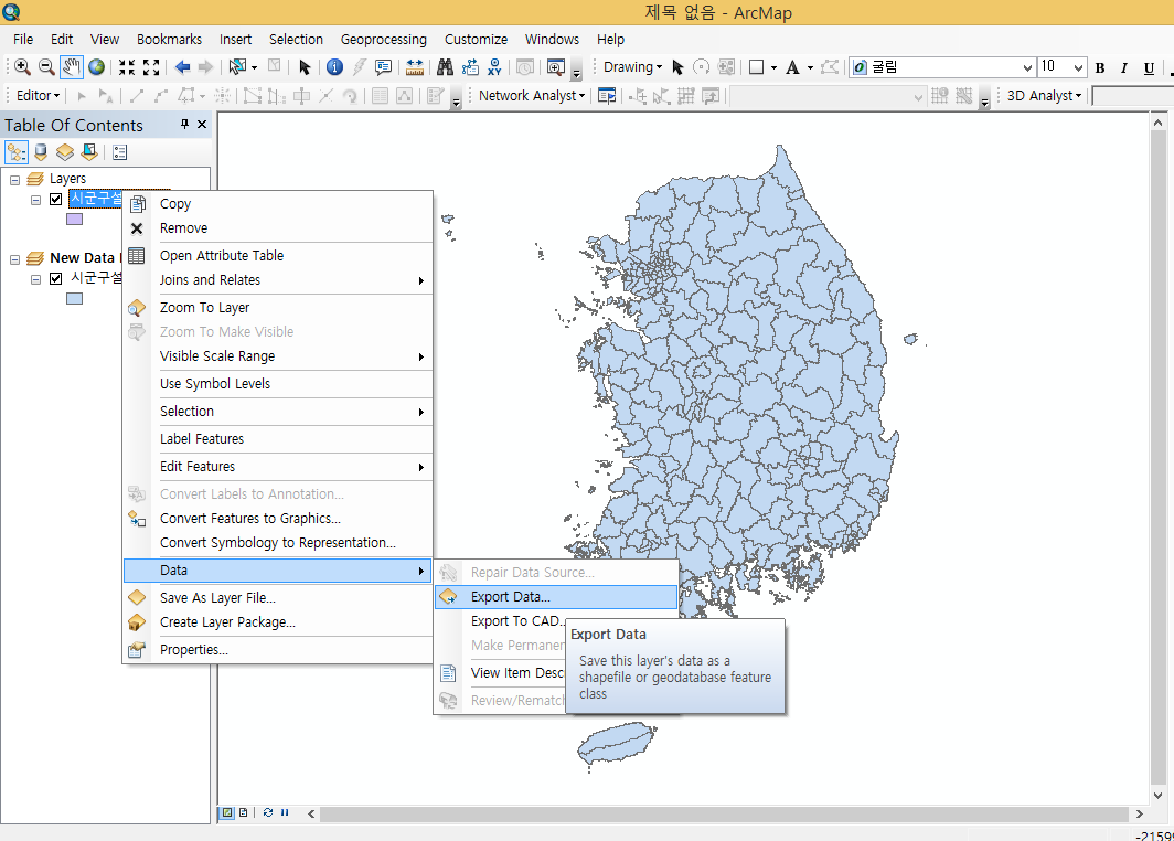 Data - Export Data를 통해 Shapefile 타입으로 데이터를 추출하여줍니다.