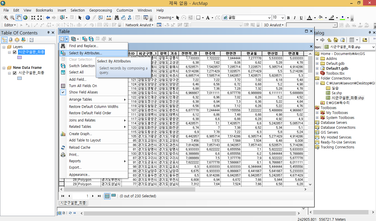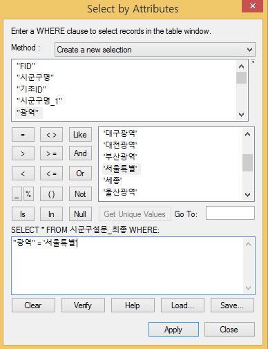 Select by Attribute 툴을 이용해서 전국구 지도에서 서울만 추출하도록 하겠습니다.