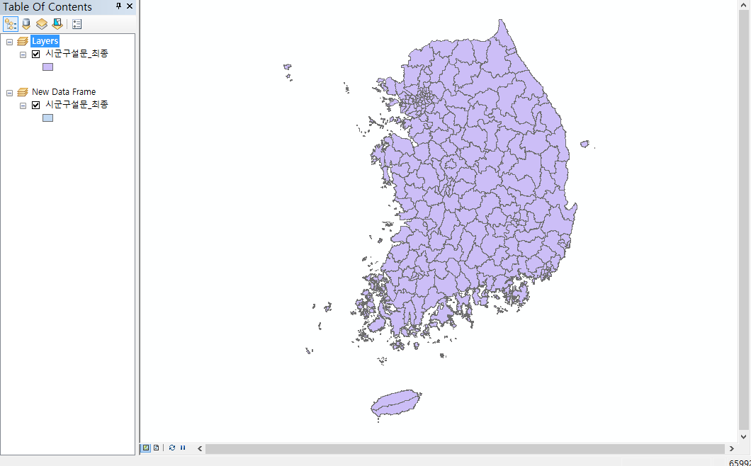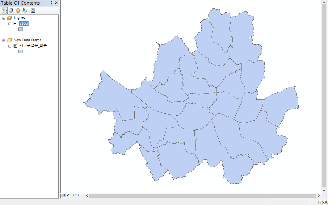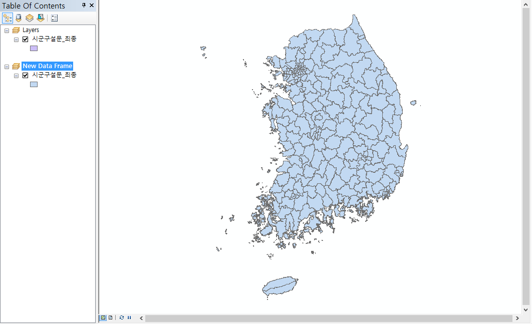 Activate를 활용하여 Layer와 Data Frame에 첨부해드린 shp파일을 추가하였습니다.