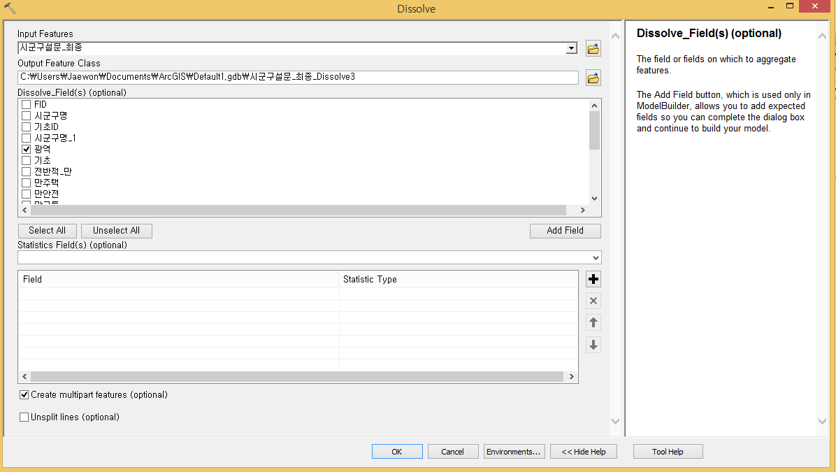 광역 필드를 기준으로 Dissolve를 실행합니다.