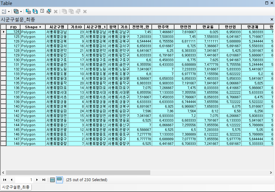 추출된 data를 추가하고, 기존에 TOC에 있던 시군구설문 shp파일을 삭제하여줍니다.