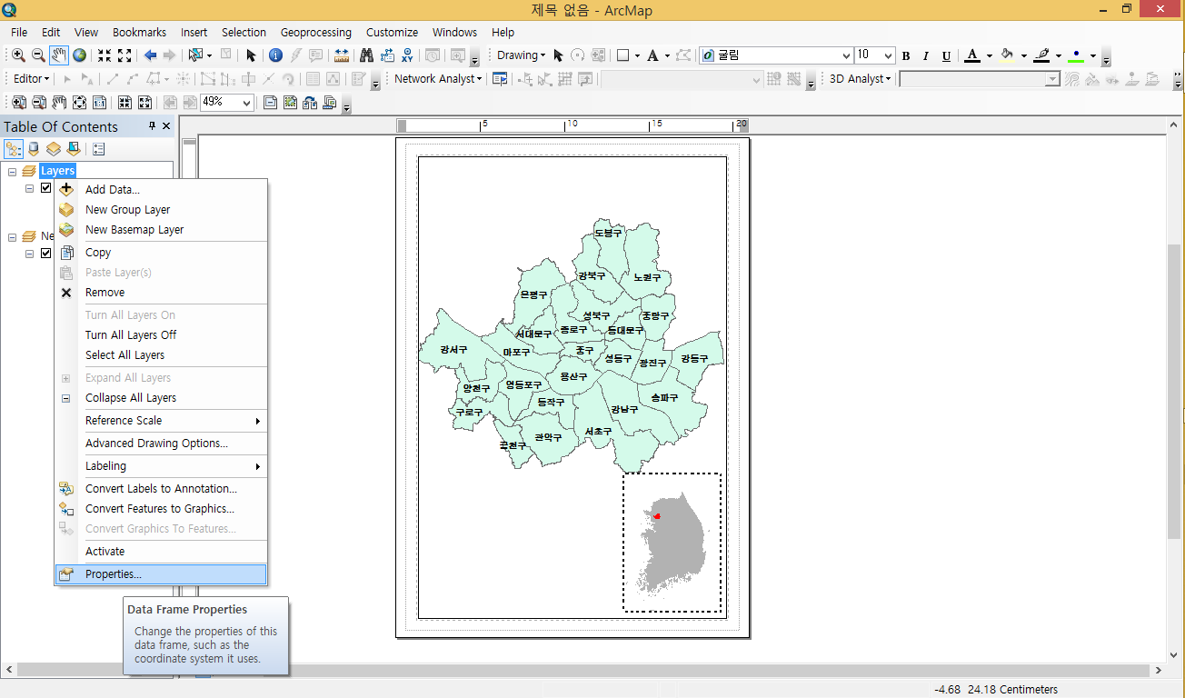Scale bar를 추가하기 이전에 Layer Properties - General 설정에서 본인이 가지고 있는 shp파일의 unit을 확인해주세요.