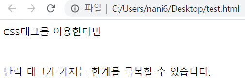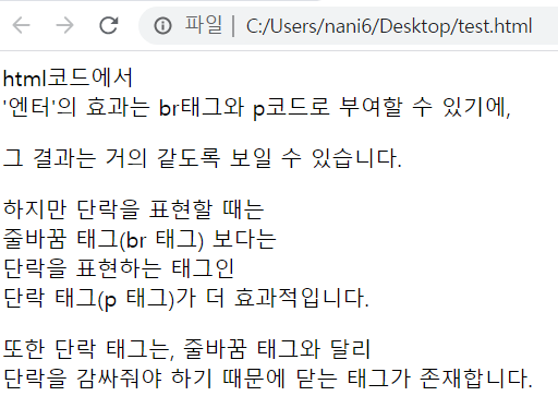 줄바꿈 태그와 달리 단락태그는 윗줄과 밑줄간의 간격에서도 차이가 있는 것을 확인할 수 있네요!
